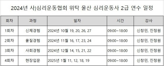 2024년 사)심리운동협회 위탁 울산 심리운동사 2급 연수 진행합니다.